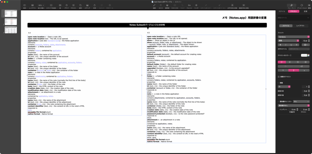 ▲Keynote書類上で2つのテキストアイテムを選択。座標値から左右を判定し、左側を比較元、右側を比較先として処理する
