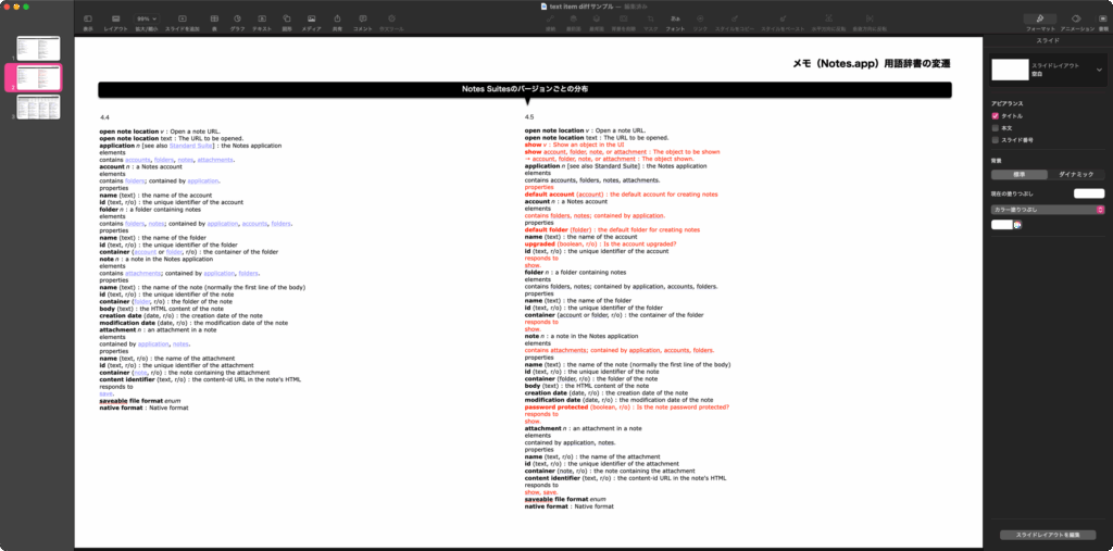 Keynote書類上で2つのテキストアイテムを選択し、左を比較元、右を比較先として行単位で差分を計算し、変更や追加が行われた行を赤く着色するAppleScriptです。