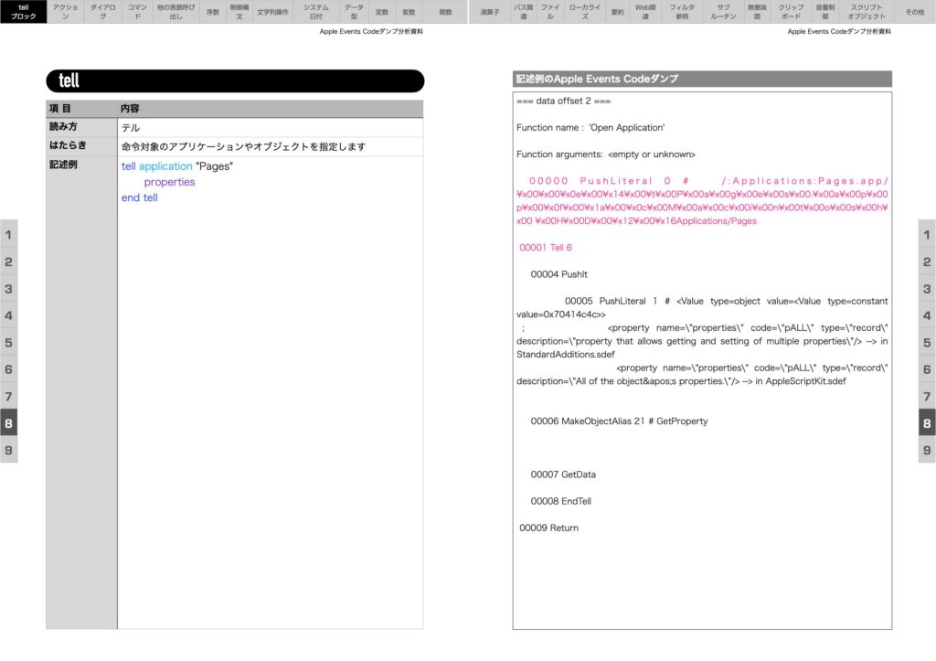 また、すべてのAppleScript予約語を含むサンプルScriptを作成し、個別にどのようにApple Events Codeにダンプされるかを掲載しています。