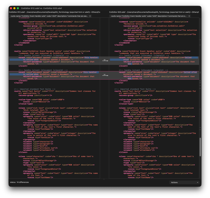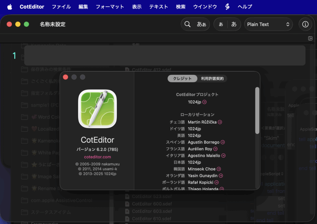 CotEditor 6.2リリース AS用語辞書に変更なし Posted on 12月 14 by Takaaki Naganoya CotEditor 6.20がリリースされました。 前バージョンから14箇所ほど変更点が見られますが、すべて説明文の内容であり機能が追加されたり変更されていることはありません。