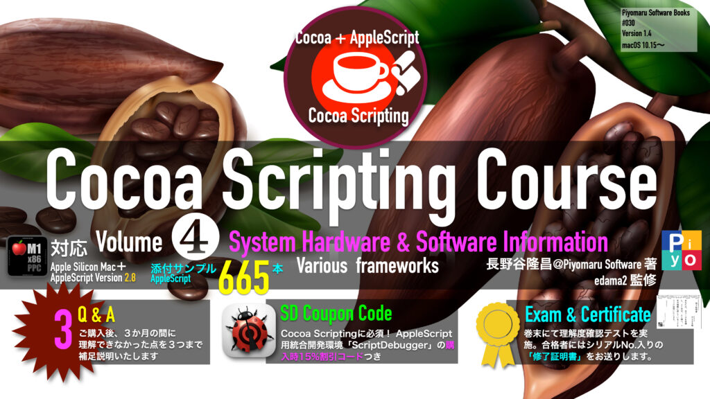 Vol.4では、 System Hardware & Software Informationを解説。AppleScriptで環境情報を取得することは、とても大事なことです。そして、この環境情報を取得したScriptを書けるかどうかというのは、自分1人のためだけの環境だけでなく、他のユーザーの環境下においても所定の動作を行えるかどうかを左右します。